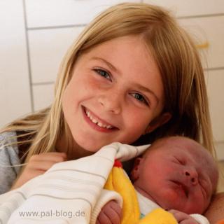 Heute war das Bild ähnlich: Nach (für ihre Verhältnisse ziemlich langem) Ausschlafen haben wir gefrühstückt, ein paar Mails beantwortet und sind ins Krankenhaus gefahren. Essen durfte ihr kleiner Bruder bei Mama - nachdem er nach der Geburt und gestern morgen so gar keine Lust darauf hatte - aber sonst wollte sie ihn halten und mit ihm kuscheln.