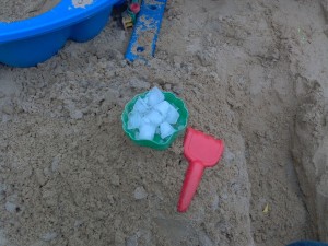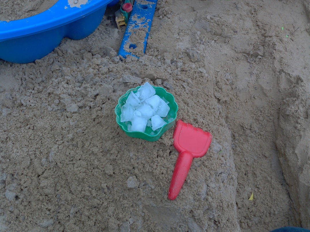 So ganz glücklich war ich nicht über die schmelzenden Eiswürfel auf dem Küchenfußboden und beförderte sie zurück nach draußen - und mein Kind wurde richtig sauer. Eine gute Viertelstunde lang musste ich ihren Zorn ertragen bevor ich sie bestechen und so beruhigen konnte: Ein Sandkastenförmchen voller Eiswürfel linderte den Schmerz. Zoe hat die Ladung gleich im Sandkasten verbuddelt, mal schauen ob daraus ein Eiswürfelbaum wächst...